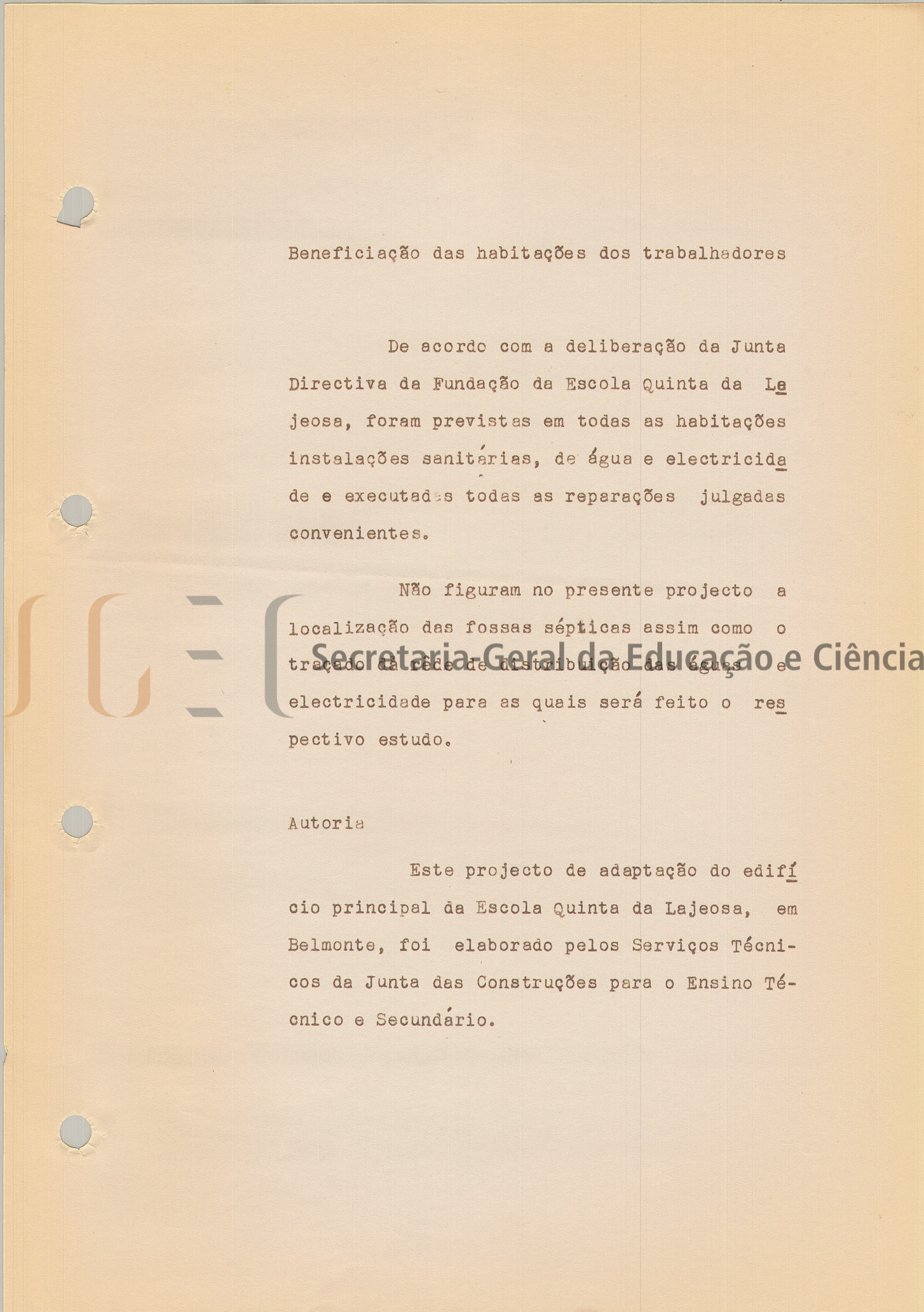 O volume das peças escritas inclui: parecer do projeto referente ao Corpo de Aulas e Internato, Habitação do Diretor, Casas A-B-C-Trabalhadores e Garagem do Diretor, apresenta visto do Presidente; memória descritiva e justificativa, com data de homologação de 13 de dezembro de 1965 (a memória menciona que este projeto consta de uma adaptação do edifício principal a aulas, internato, residência do Regente Agrícola e beneficiação das habitações do pessoal); custo da obra; cálculos; caderno de encargos; medições; mapas de medições e orçamento.