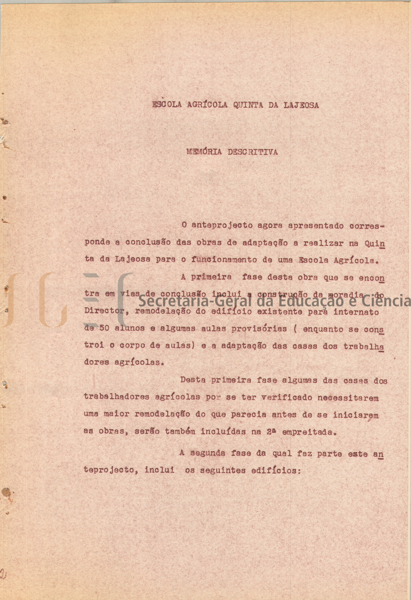 Anteprojeto constituído por 1 volume de peças escritas e peças desenhadas (volume n.º 140), que inclui: parecer; memória descritiva assinada pela Arq.º Maria do Carmo Matos, a 15 de fevereiro de 1968 refere o seguinte: "O anteprojecto agora apresentado corresponde à conclusão das obras de adaptação a realizar na Quinta da Lajeosa para o funcionamento de uma Escola Agrícola. A primeria fase desta obra que se encontra em vias de conclusão inclui a construção da moradia do Director, remodelação do edifício existente para internato de 50 alunos e algumas aulas provisórias... A segunda fase da qual faz parte este anteprojecto, inclui os seguintes edifícios..."; estimativa do custo e 14 peças desenhadas compostas por: planta topográfica e de localização; plantas dos vários pavimentos; alçados e cortes.