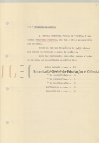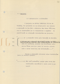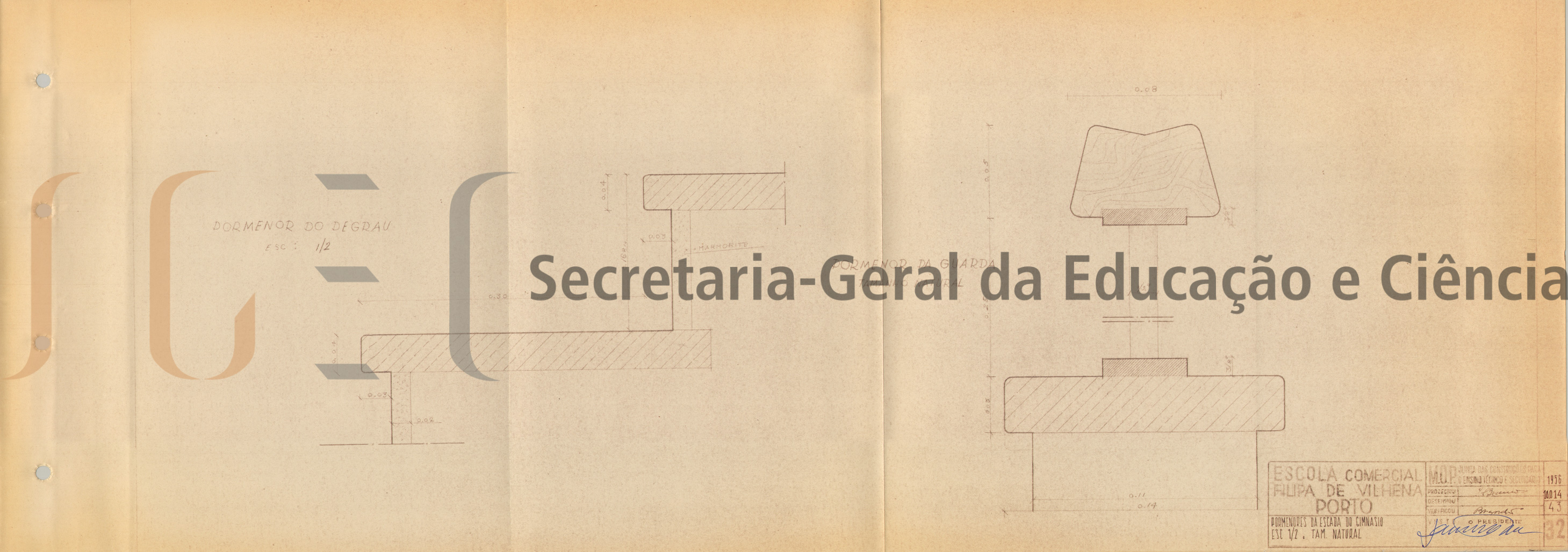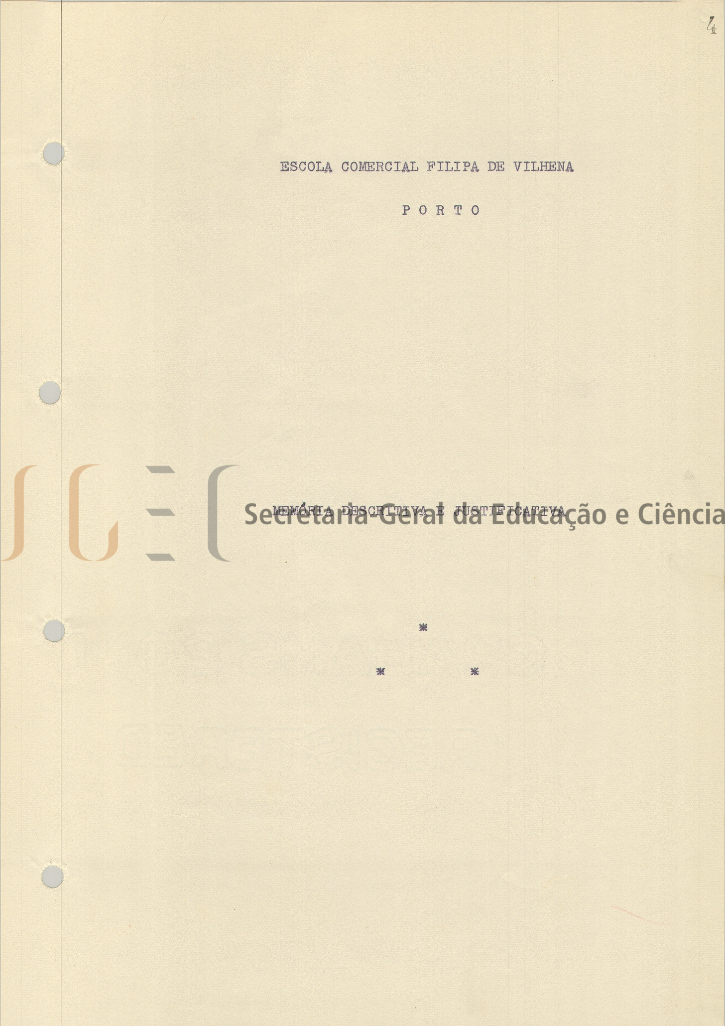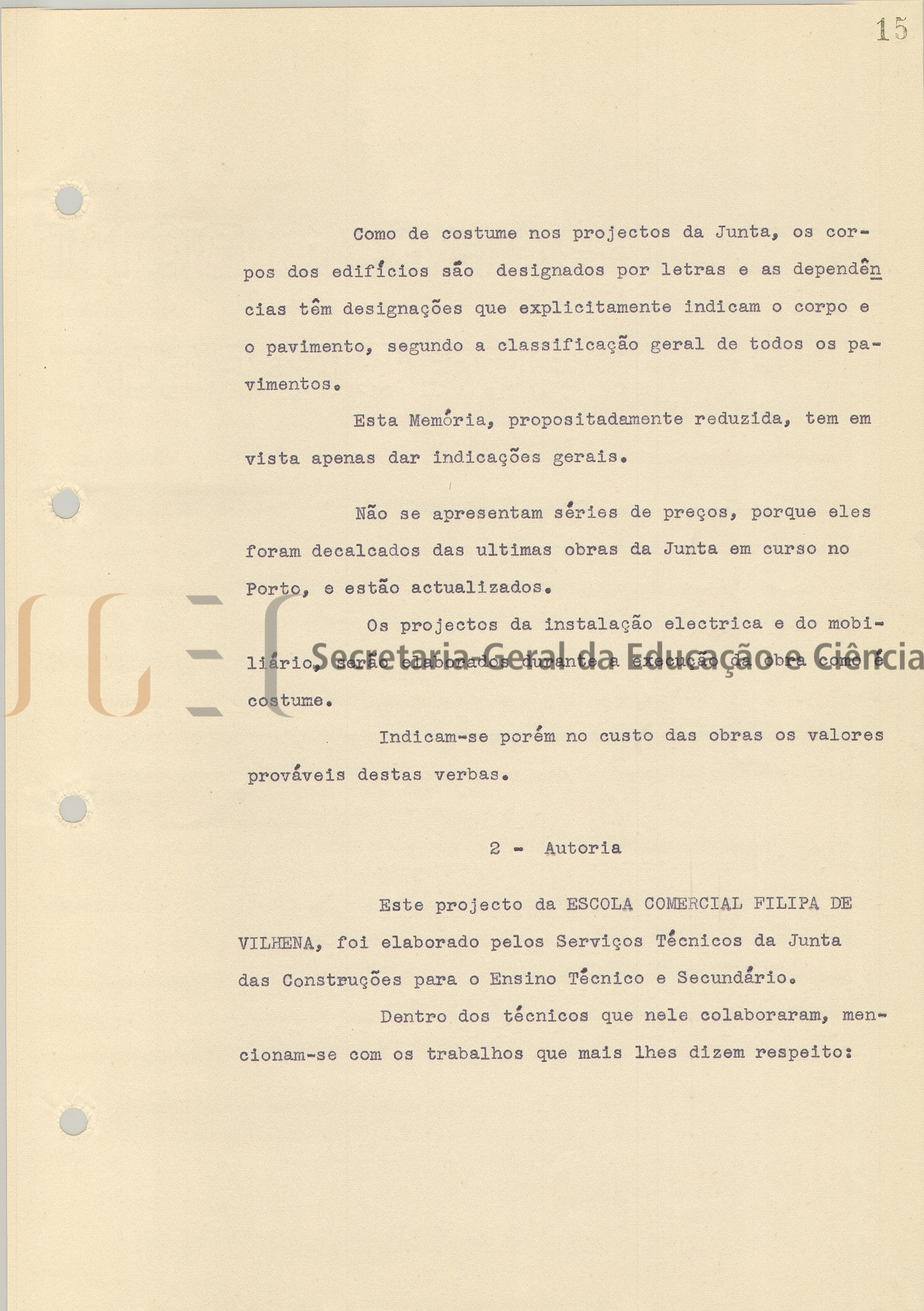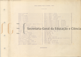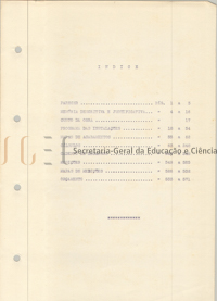 O volume das peças escritas inclui: índice; parecer, com data de homologação de 15 de outubro de 1956; memória descritiva e justificativa, com a mesma data de homologação; custo da obra; programa das instalações; mapa de acabamentos; cálculos; caderno de encargos, medições; mapa de medições e orçamento.