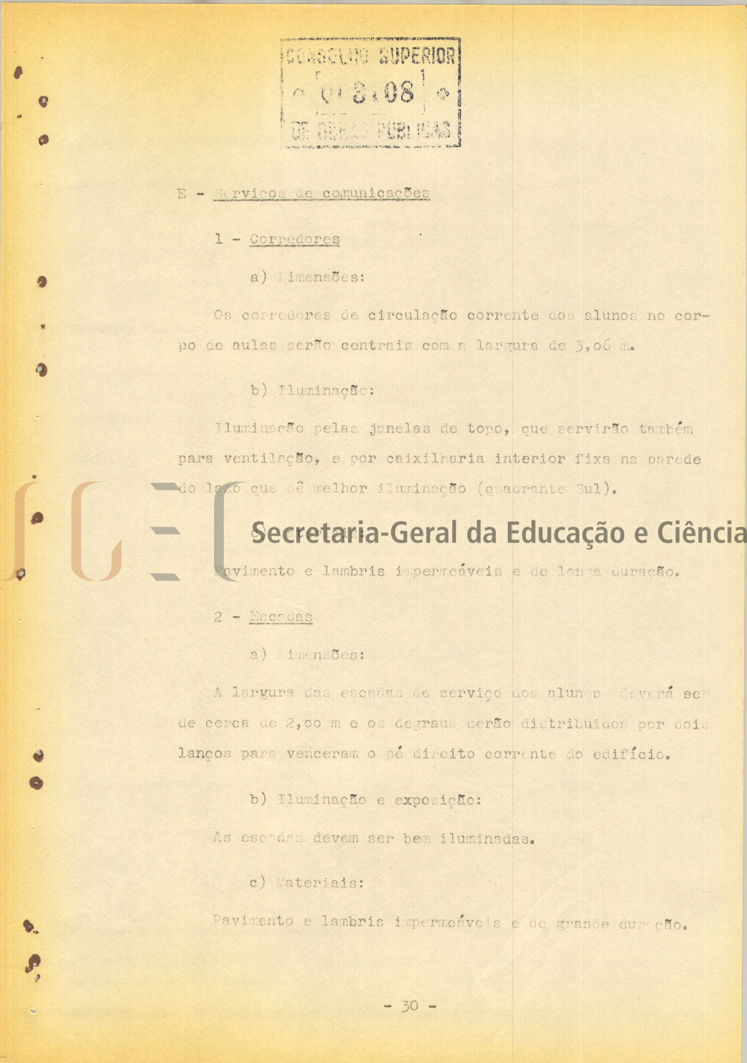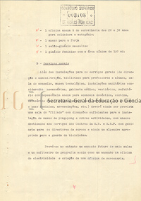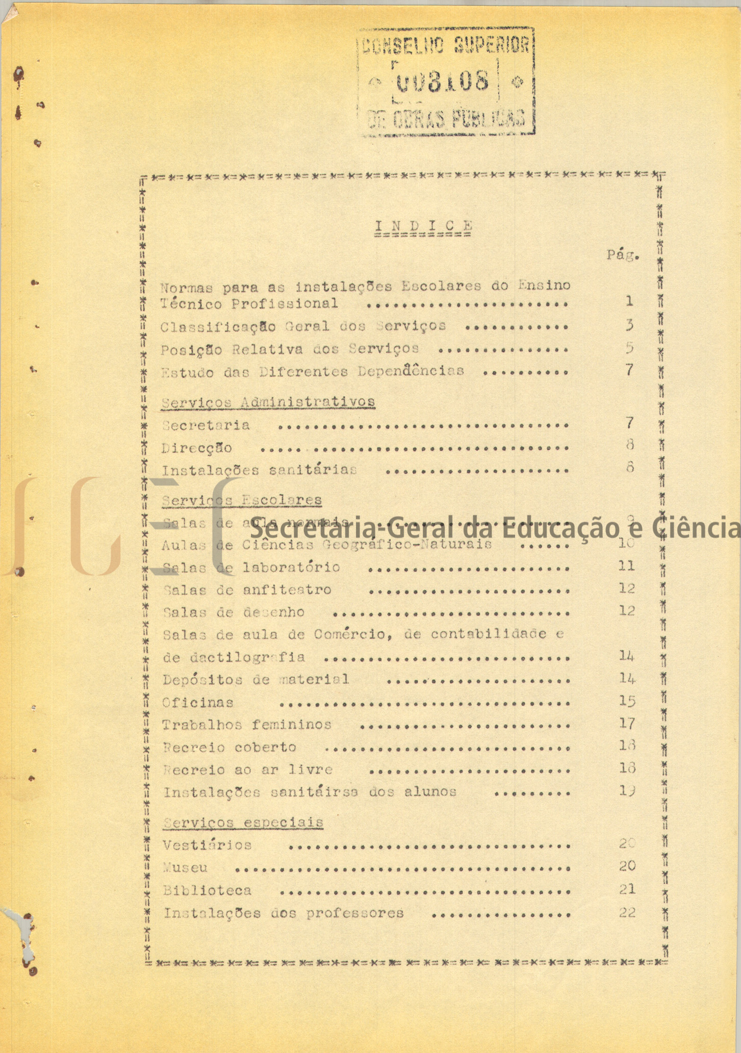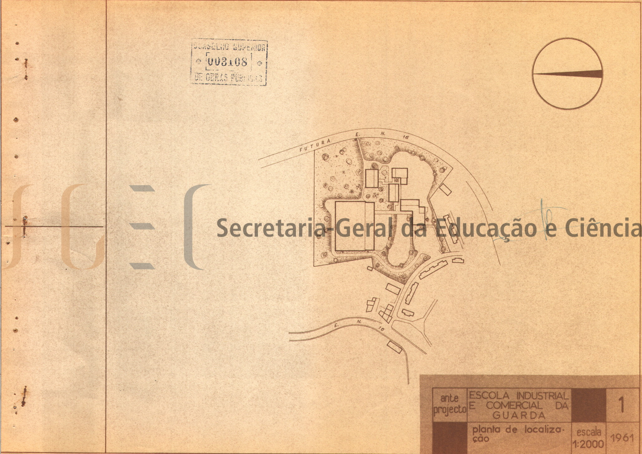 Âmbito e conteúdo Anteprojeto constituído por 1 volume de peças escritas e peças desenhadas (volume n.º 337), com carimbo n.º 003108 do Conselho Superior de Obras Públicas, que inclui: parecer, com data de homologação de 28 de outubro de 1961; memória descritiva e justificativa ("A Escola Industrial e Comercial da Guarda foi criada no ano lectivo de 1956/57, funcionando nos dois primeiros anos apenas com ciclo preparatório, tendo sido dotada, a partir de 1958/59 com os cursos profissionais..."); normas gerais para as instalações das Escolas do Ensino Técnico Profissional; estimativa de custo e 14 peças desenhadas compostas por: planta de localização; planta geral; plantas dos vários pavimentos; alçados e cortes.