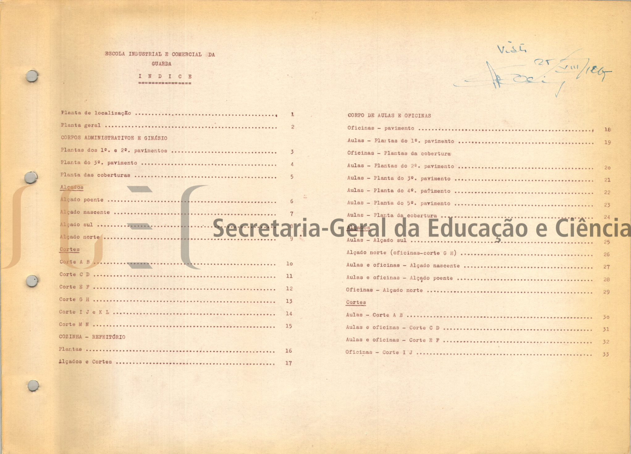 O volume das peças escritas inclui: parecer, com data de homologação de 25 de agosto de 1965; cópia de ofício de 26 de julho de 1961, do Vice-Presidente da Câmara Municipal Fausto Castelo Rodrigues para o Engenheiro Administrador Delegado da Junta das Construções para o Ensino Técnico e Secundário; memória descritiva e justificativa, também com homologação; custo da obra; cálculos; caderno de encargos; medições e orçamento.