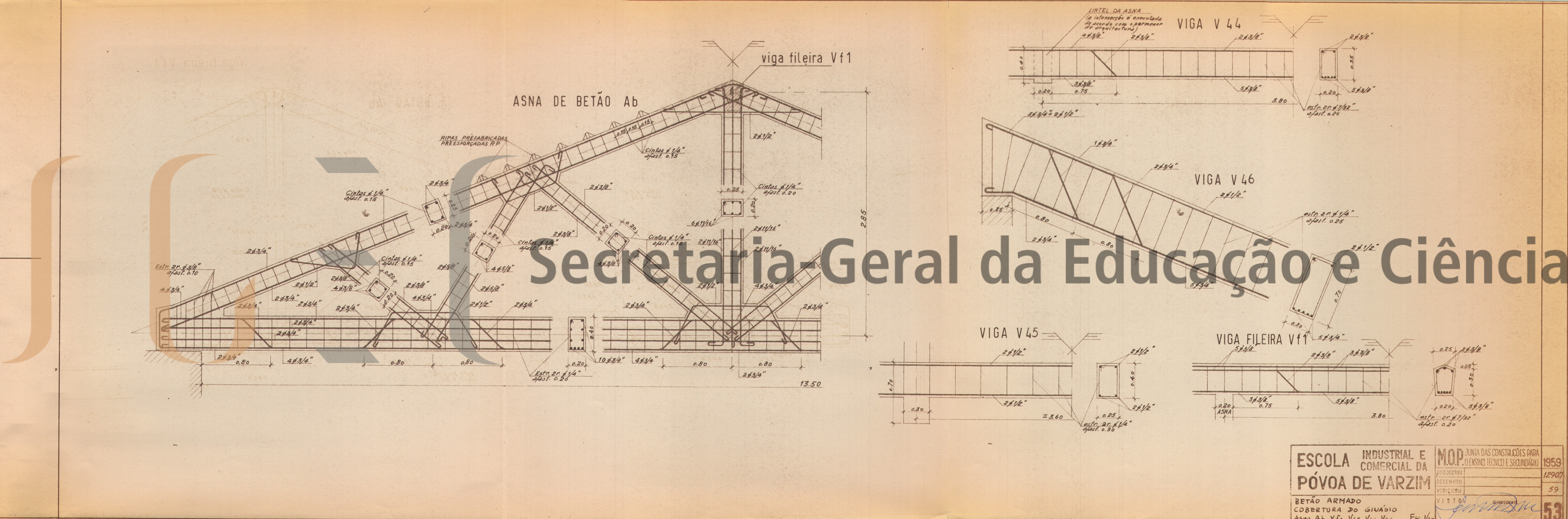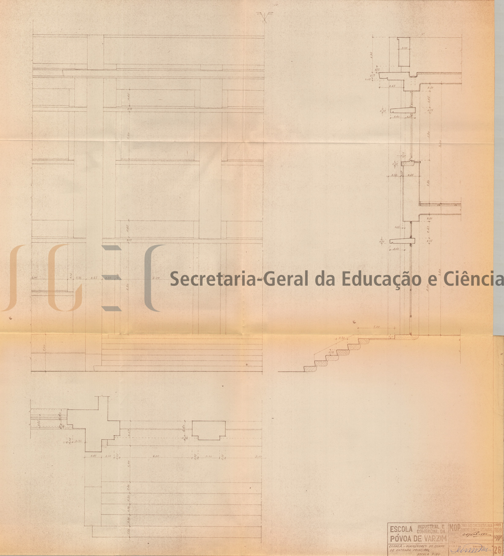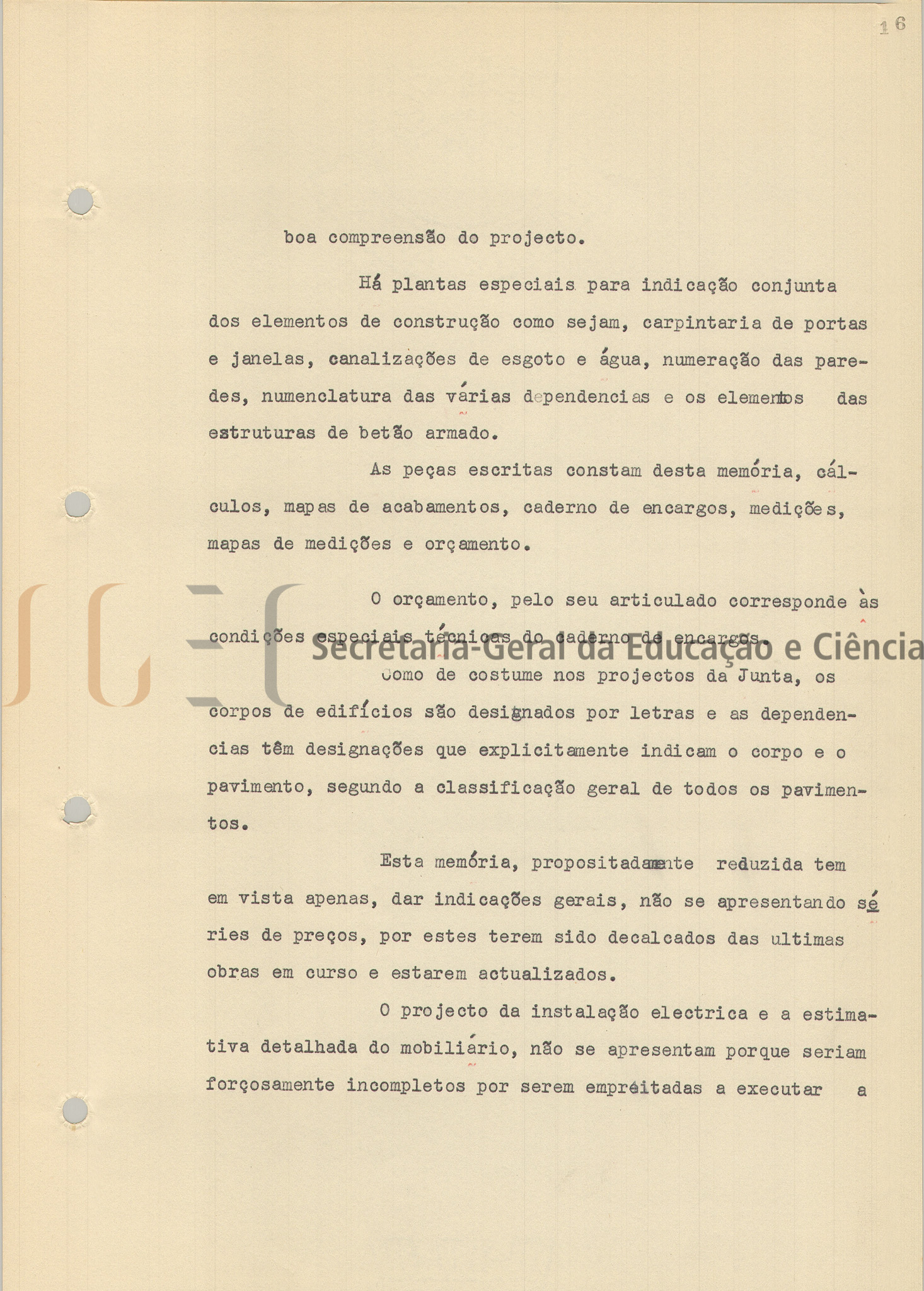 O volume das peças escritas inclui: índice; parecer, com data de homologação de 10 de novembro de 1959; memória descritiva e justificativa, também com a mesma data de homologação; custo da obra; programa das instalações; cálculos de estabilidade; caderno de encargos; medições; mapas de medições e orçamento.