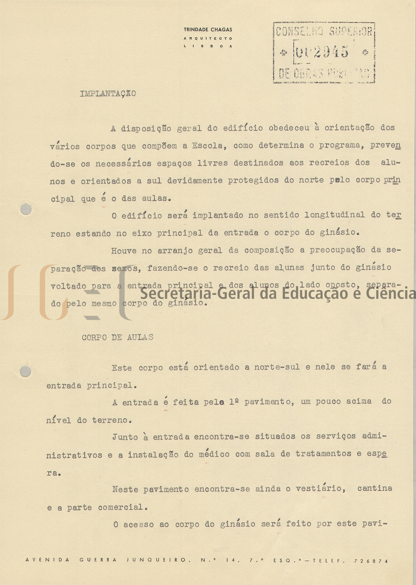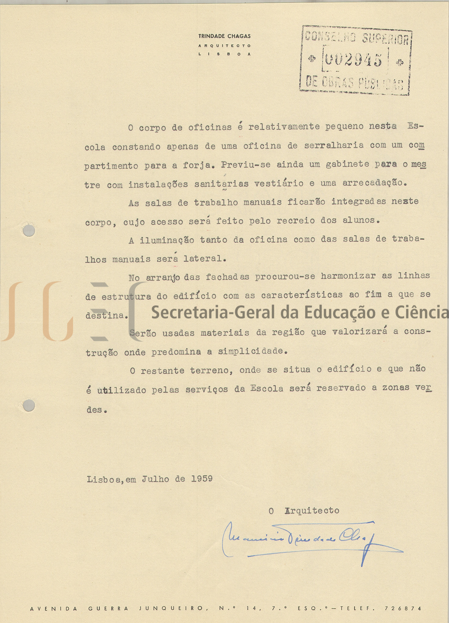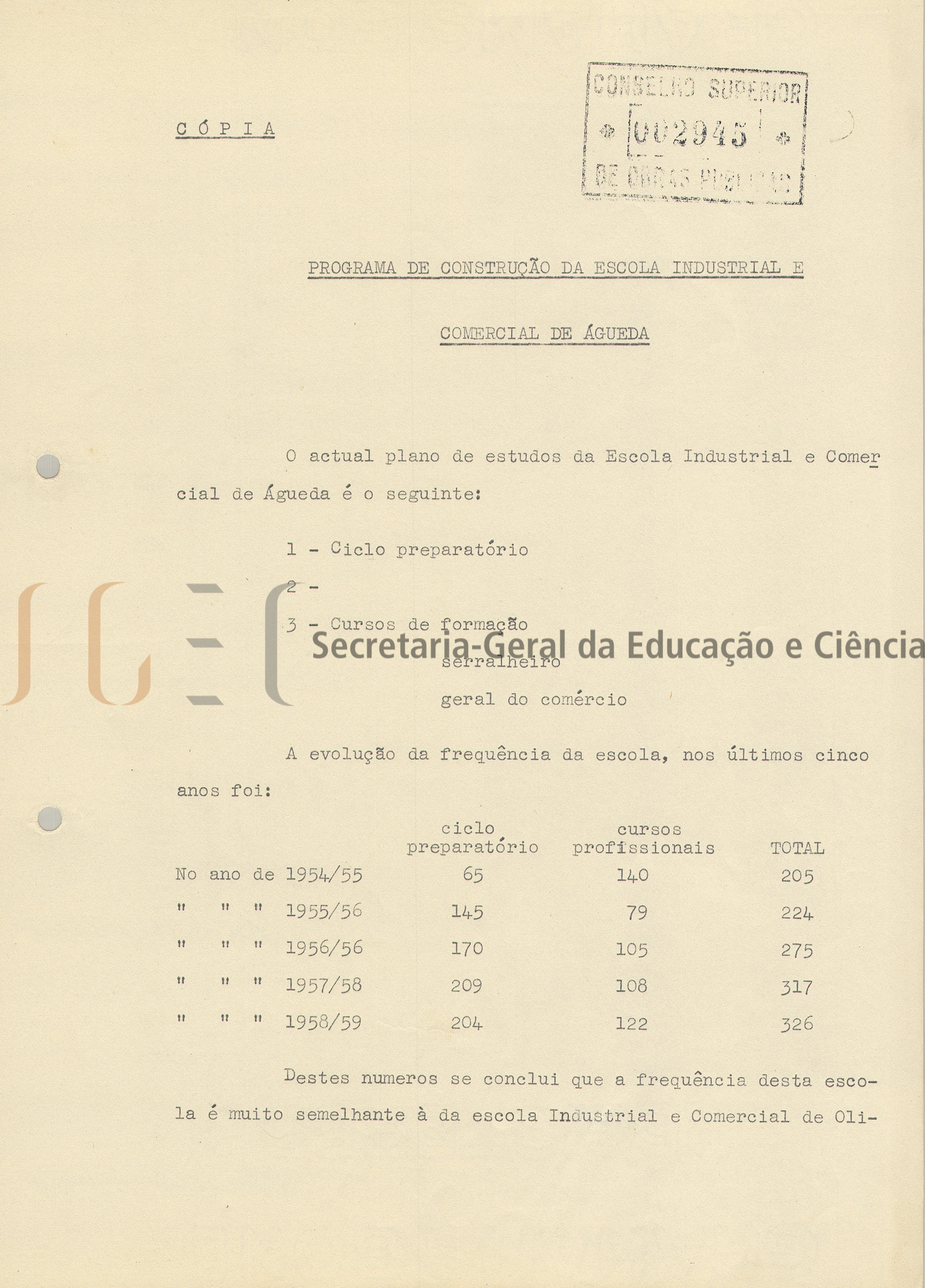 Ante-projeto constituído por 1 volume de peças escritas e peças desenhadas (volume n.º 3) e inclui: parecer, com data de homologação de 17 de novembro de 1959 e carimbo com n.º 2945; memória descritiva e justificativa, com a mesma data de homologação; cópia do programa de construção da Escola Industrial e Comercial de Águeda; normas gerais para as instalações das Escolas do Ensino Técnico Profissional; estimativa de custo e estimativa de custo elaborado de acordo com despacho de 20 de dezembro de 1956; cópia do ofício com parecer da Câmara Municipal de Águeda, de 18 de agosto de 1959 e 12 peças desenhadas compostas por: planta de trabalho; perspetiva; planta topográfica; planta geral; plantas dos vários pavimentos; alçados e cortes.