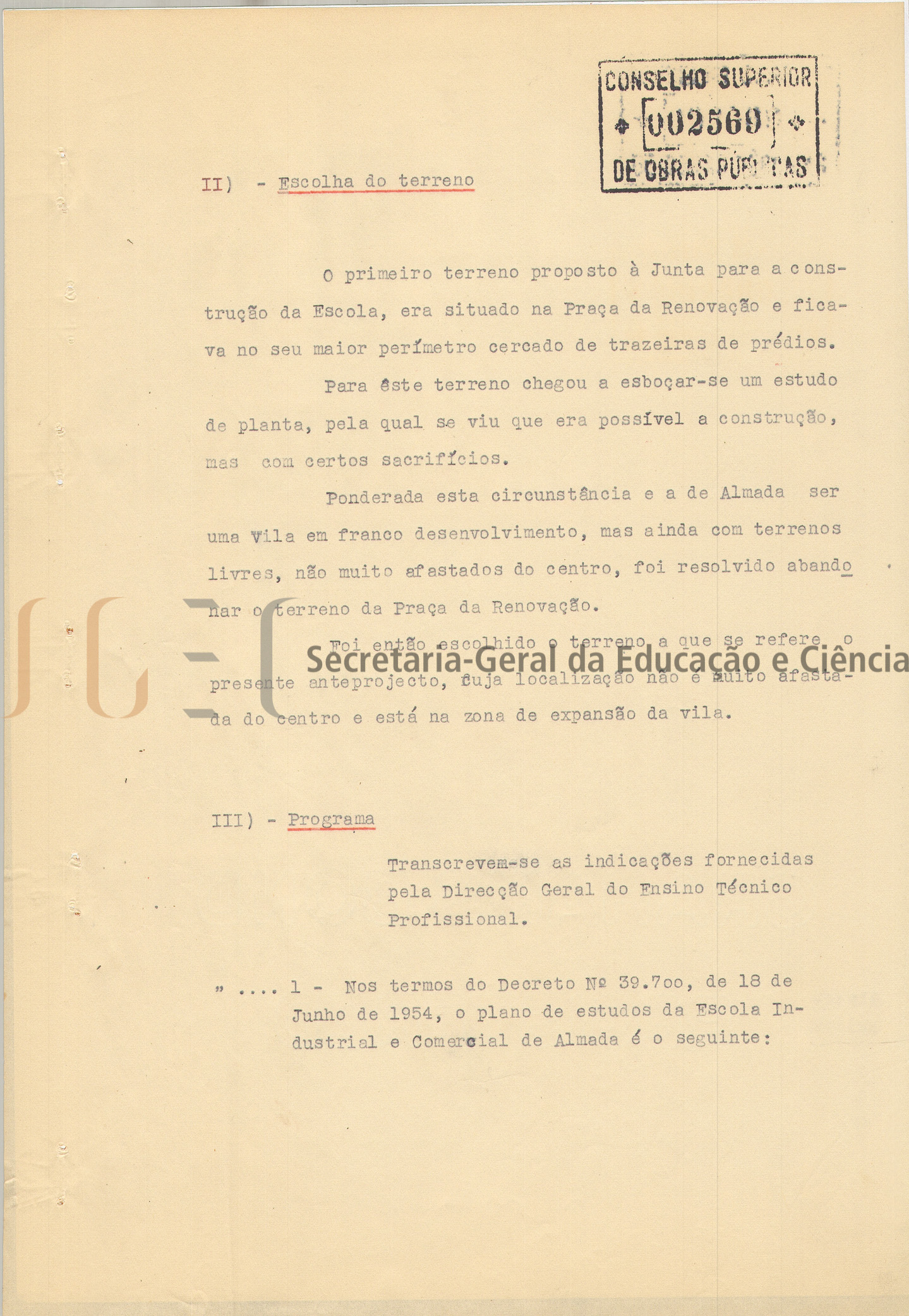Âmbito e conteúdo Ante-projeto constituído por 1 volume de peças escritas e desenhadas (volume n.º 773), que inclui: parecer; comparação do programa com o ante-projeto; memória descritiva e justificativa; normas para as instalações escolares do Ensino Técnico Profissional; 1 planta topográfica; estimativa de custo e 12 peças desenhadas compostas por: planta de localização; planta geral; plantas dos vários pavimentos; cortes e alçados.