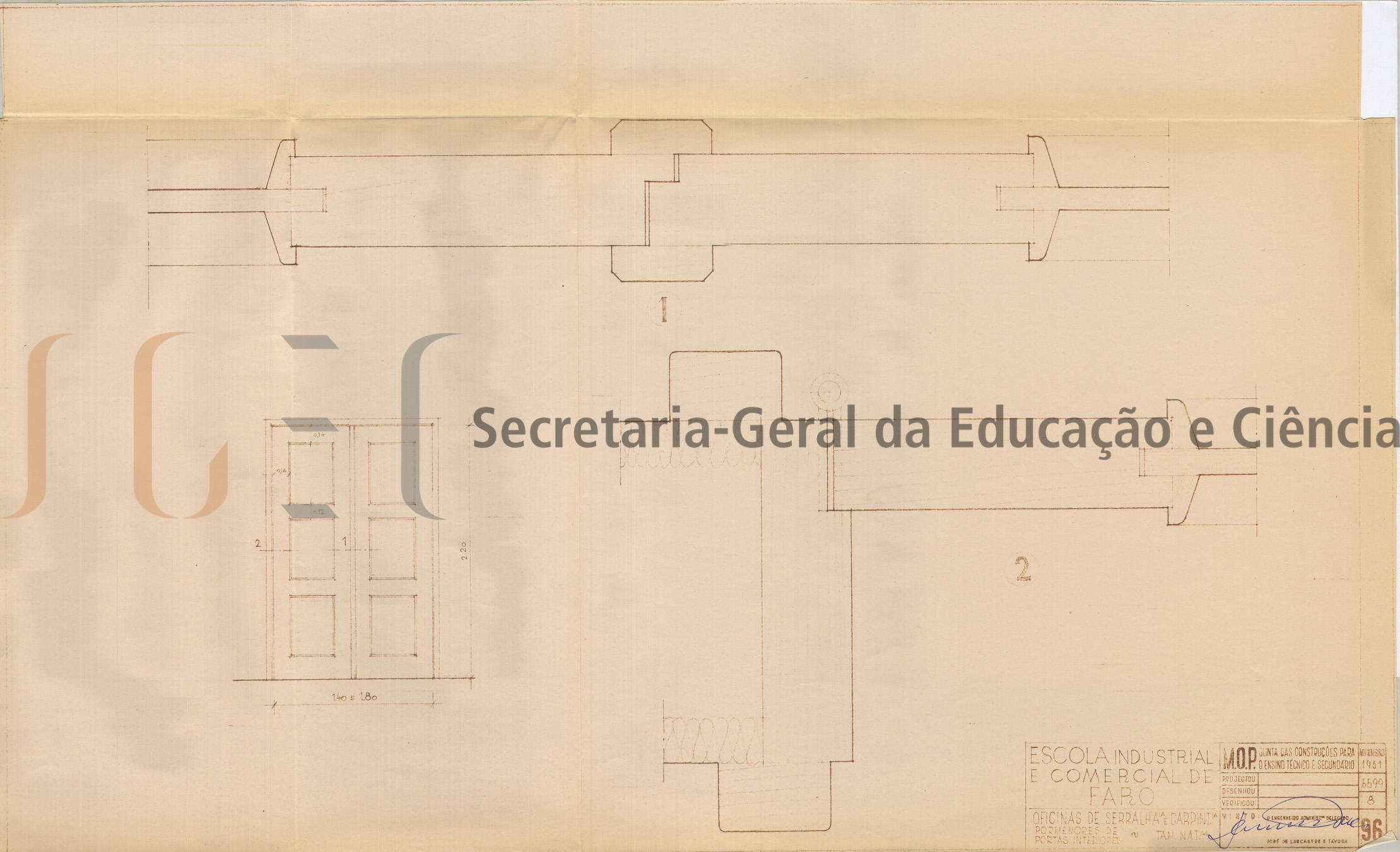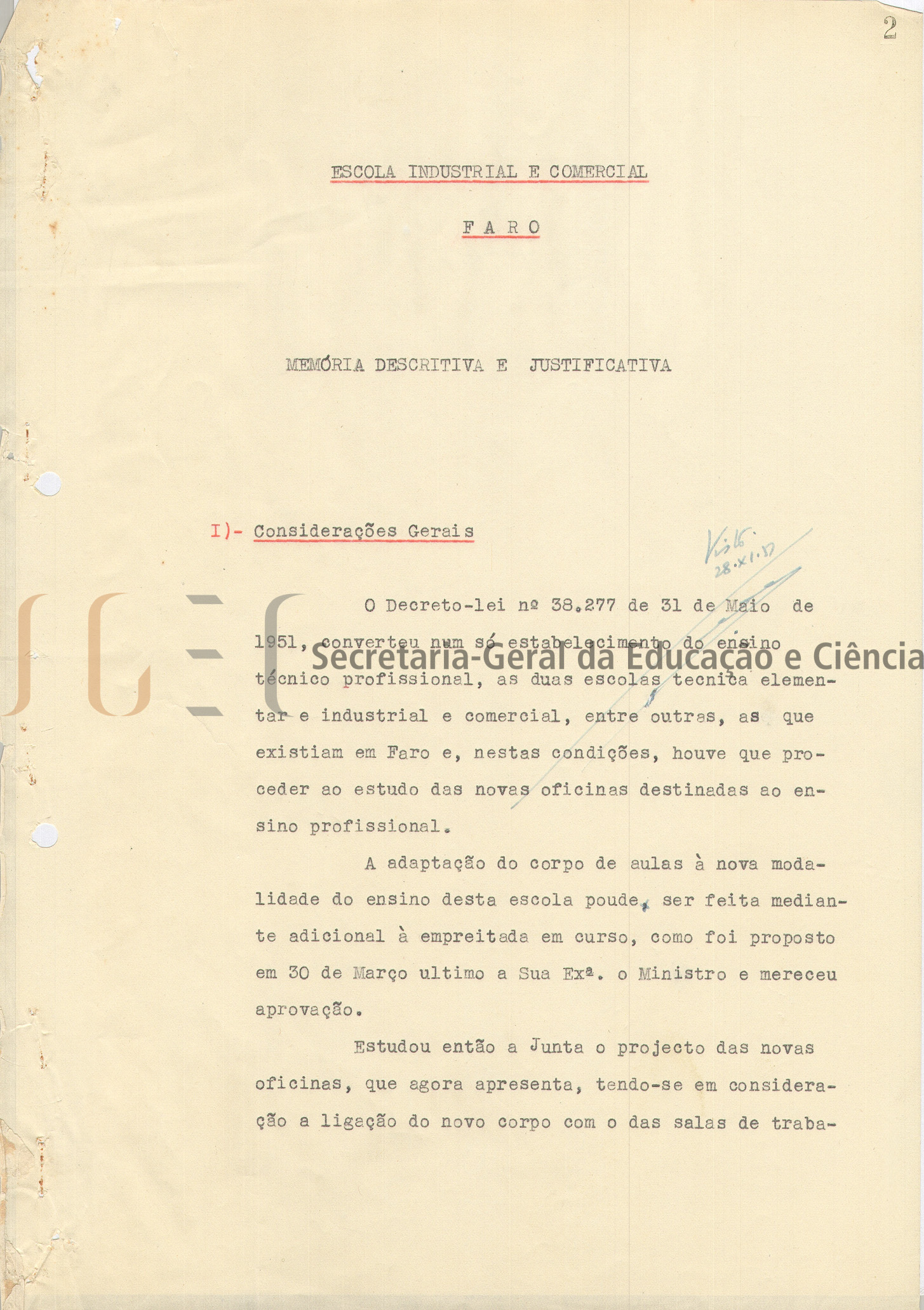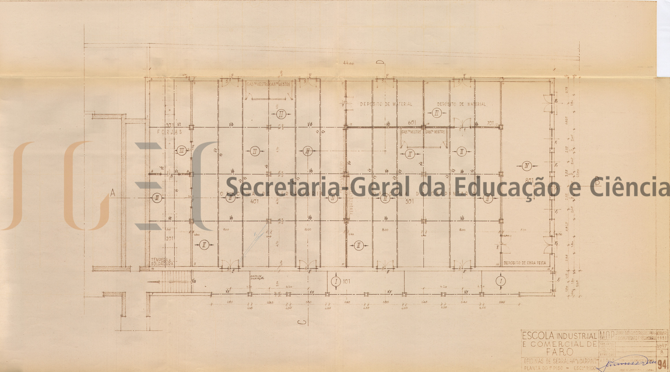 Projeto das oficinas de serralharia e carpintaria constituído por 1 volume de peças escritas e desenhadas (volume n.º 286) e inclui: índice; memória descritiva e justificativa, com data de visto de 28 de novembro de 1951 (referência ao Decreto-Lei n.º 38.277, de 31 de maio de 1951, que converteu num só estabelecimento de ensino técnico profissional, as duas escolas técnica elementar e industrial e comercial, entre outras, as que existiam em Faro e neste sentido houve necessidade de proceder ao estudo das novas oficinas destinadas ao ensino profissional); cálculos de betão armado; medições; caderno de encargos; orçamento, com data de 27 de novembro de 1951 e 8 peças desenhadas compostas por: planta geral; planta das fundações; planta do 1.º piso; alçados e cortes e pormenores (portas interiores; caixilharias; portas exteriores; caixilhos e betão armado).
