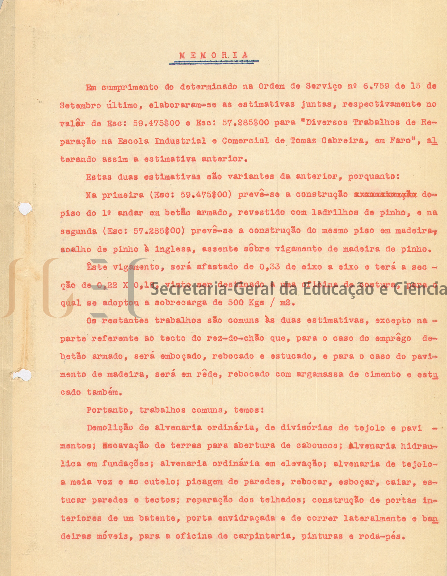 O volume n.º 288 contém documentação de diversos assuntos, tais como: troca de correspondência sobre instalação elétrica nas oficinas de serralharia e carpintaria da Escola Industrial e Comercial Tomás Cabreira, construção das oficinas (1953); processo sobre obras de conservação do edifício; trabalhos de reparação; construção das retretes (1938-1940) e inclui: troca de correspondência; relações de documentos de despesa; propostas; pareceres; memórias descritivas (1938); orçamentos; cálculos; medições e 4 peças desenhadas do estudo de transformações a realizar, compostas por: planta do r/chão; cortes do 1.º andar; detalhes de betão; processo referente à construção de um edifício de gaveto na Av. 5 de outubro com a Av. de Olivença, inclui: troca de correspondência e 1 peça desenhada com o estudo (1965).