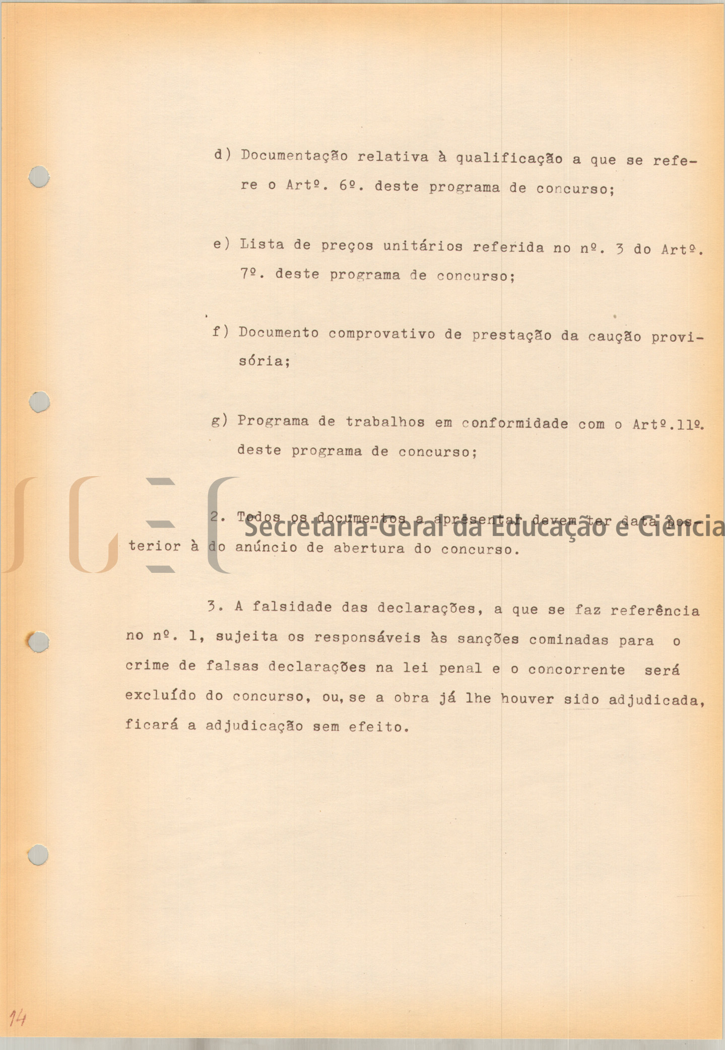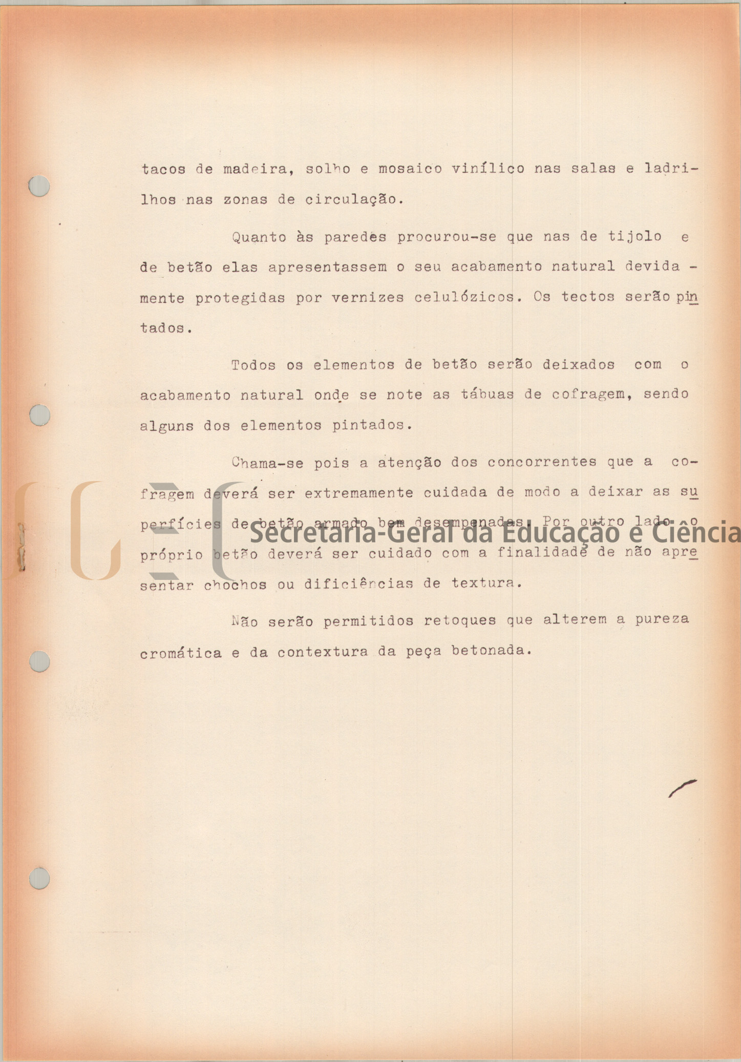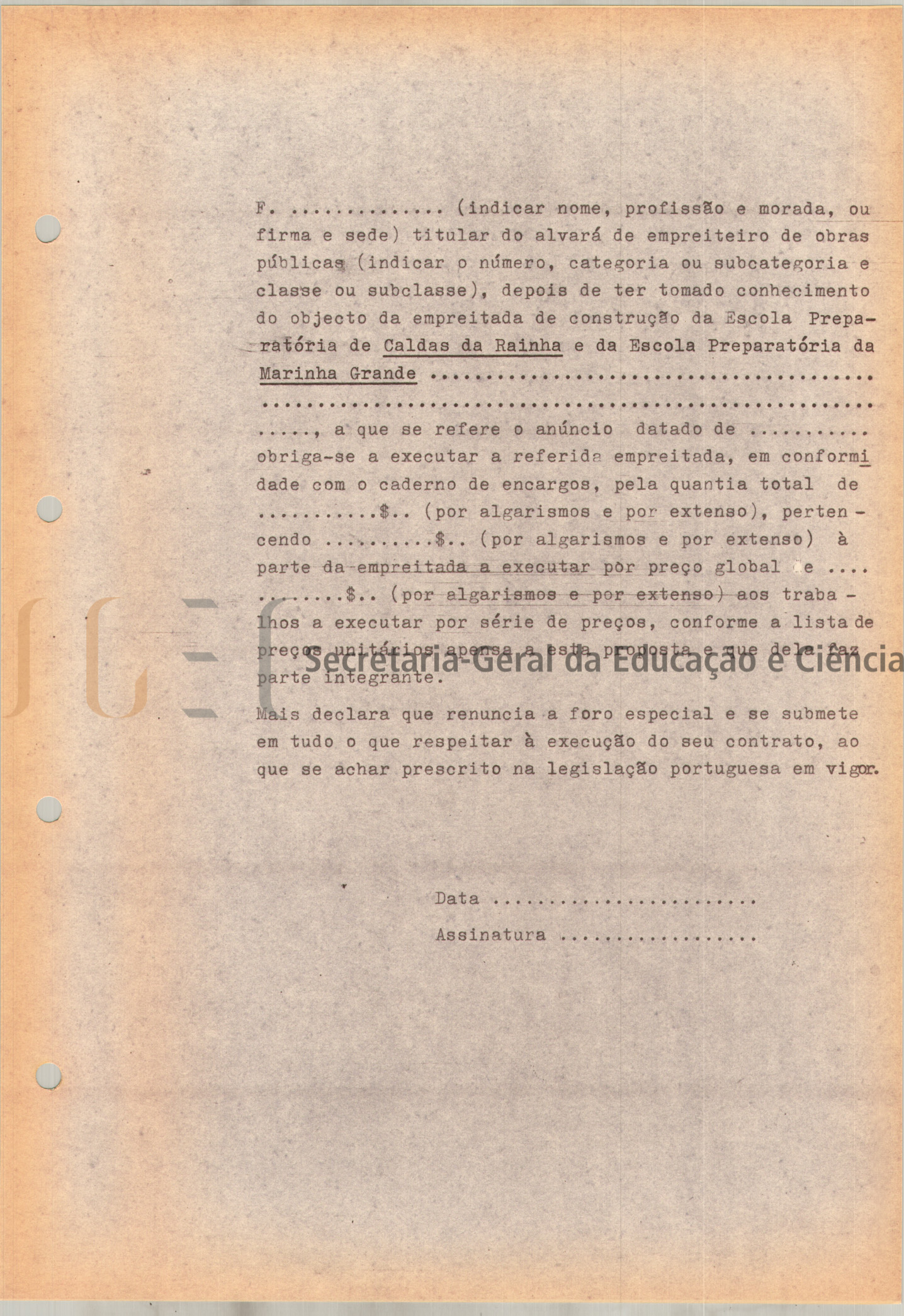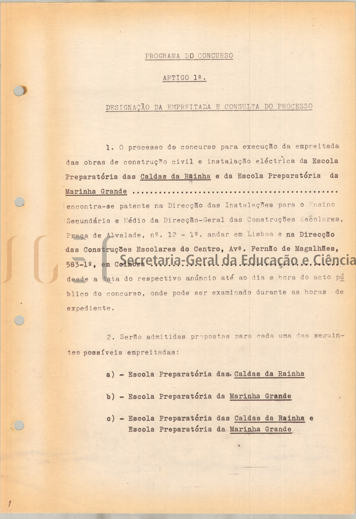 O volume das peças escritas inclui: programa de concurso para execução da empreitada das obras de construção civil e instalação elétrica da Escola Preparatória das Caldas da Rainha e da Escola Preparatória da Marinha Grande; nota descritiva; mapas de medições; orçamento e caderno de encargos (cláusulas jurídicas e técnicas gerais; cláusulas jurídicas especiais e cláusulas técnicas especiais).
