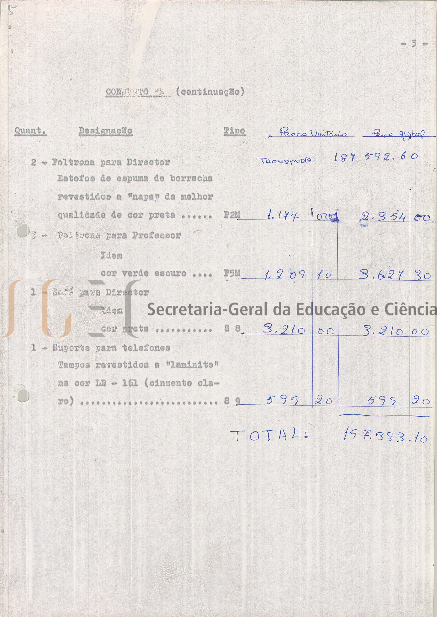 A relação do mobiliário a fornecer inclui: as quantidades, a designação do material/equipamento e o tipo. A 2.ª relação do mobiliário a fornecer para o internato, tem a indicação dos fornecedores: nome e morada, a referência ao conjunto "A, B e C", com indicação das quantidades, designação, tipo, preço unitário e preço global.