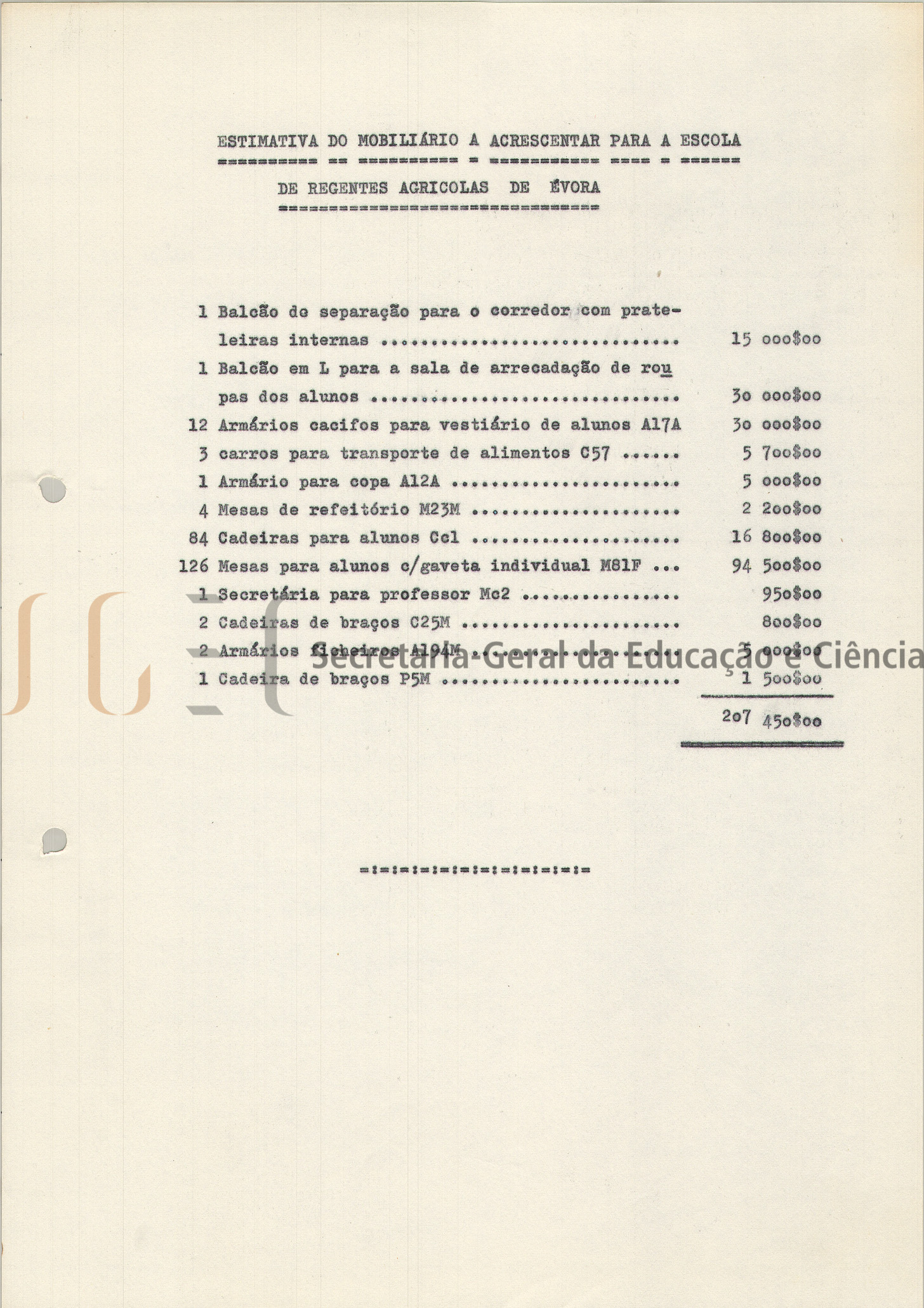 O volume com a designação de "Mobiliário escolas", inclui um índice com a relação do mobiliário de todas as escolas aqui referenciadas e um envelope por escola.