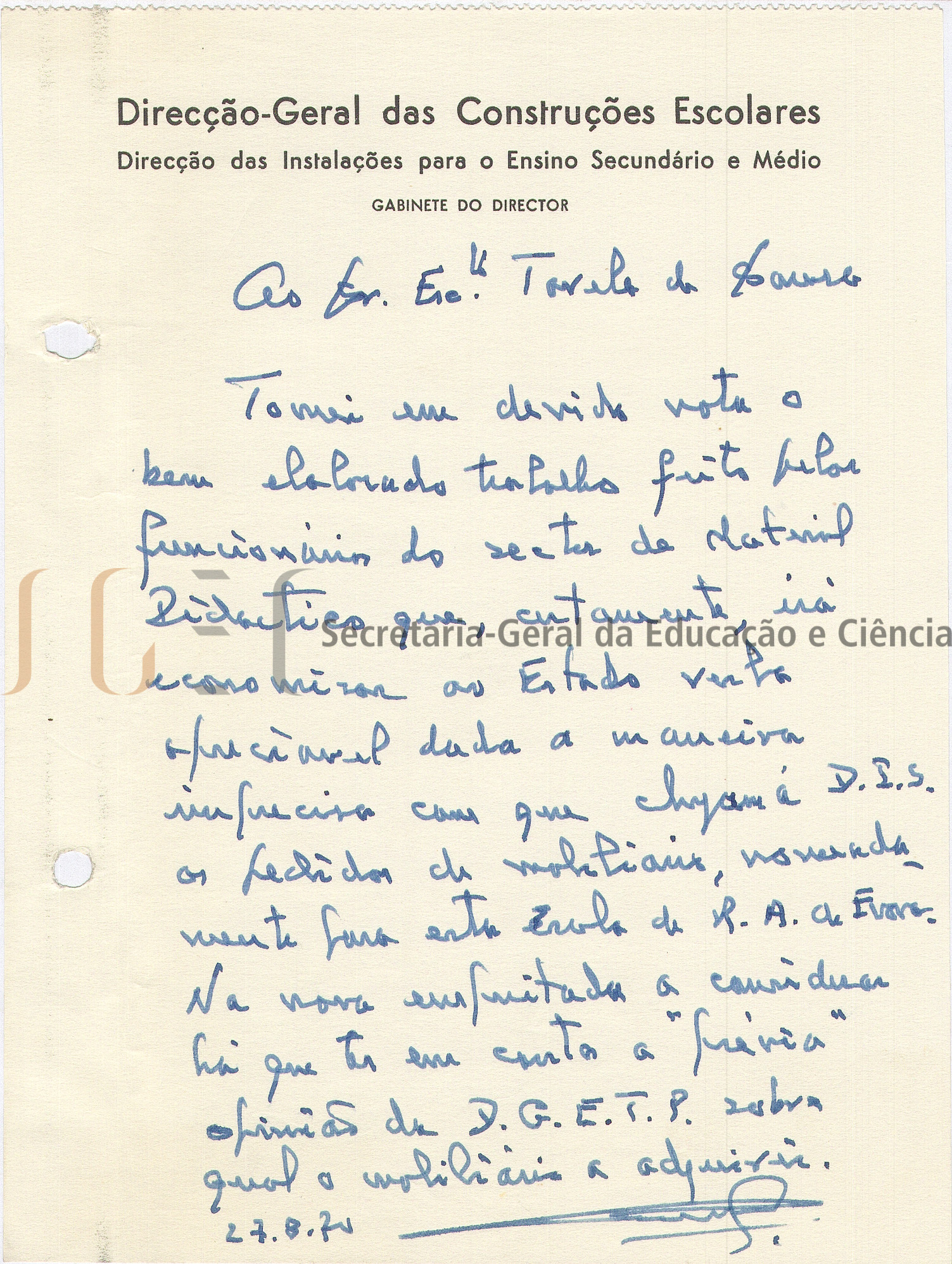 O envelope do Ministério das Obras Públicas, Junta das Construções para o Ensino Técnico e Secundário, apresenta no canto superior direito o n.º 69, que corresponde à numeração sequencial das escolas referenciadas no índice, a designação da escola, Escola de Regentes Agrícolas de Évora e o assunto "Relação do mobiliário a fornecer, Relação do mobiliário fornecido" e o n.º 87, que corresponde ao número do processo.
