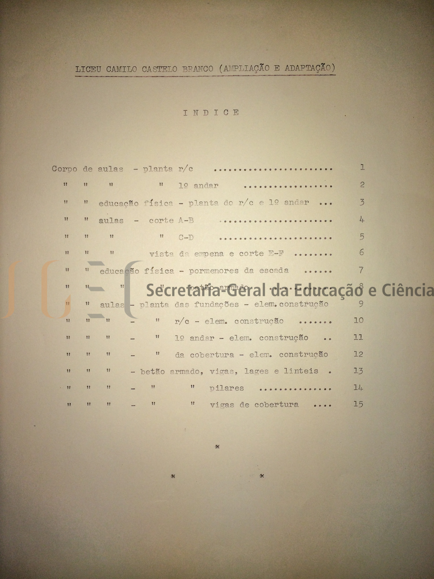 O volume das peças desenhadas é composto por 15 peças e inclui: índice; várias plantas do corpo das aulas e do corpo de educação física (plantas dos pavimentos; cortes; pormenores; cobertura; fundações e estruturas)."