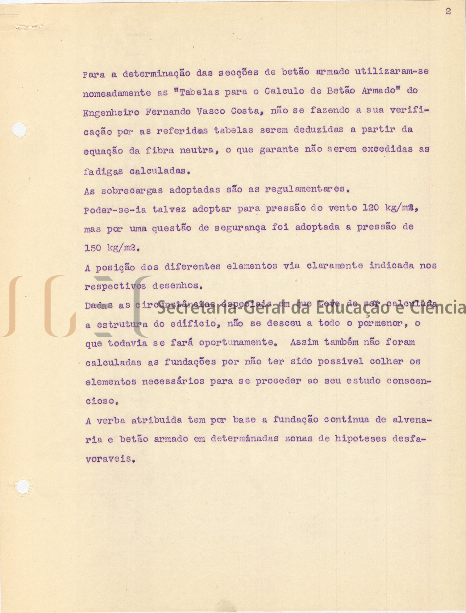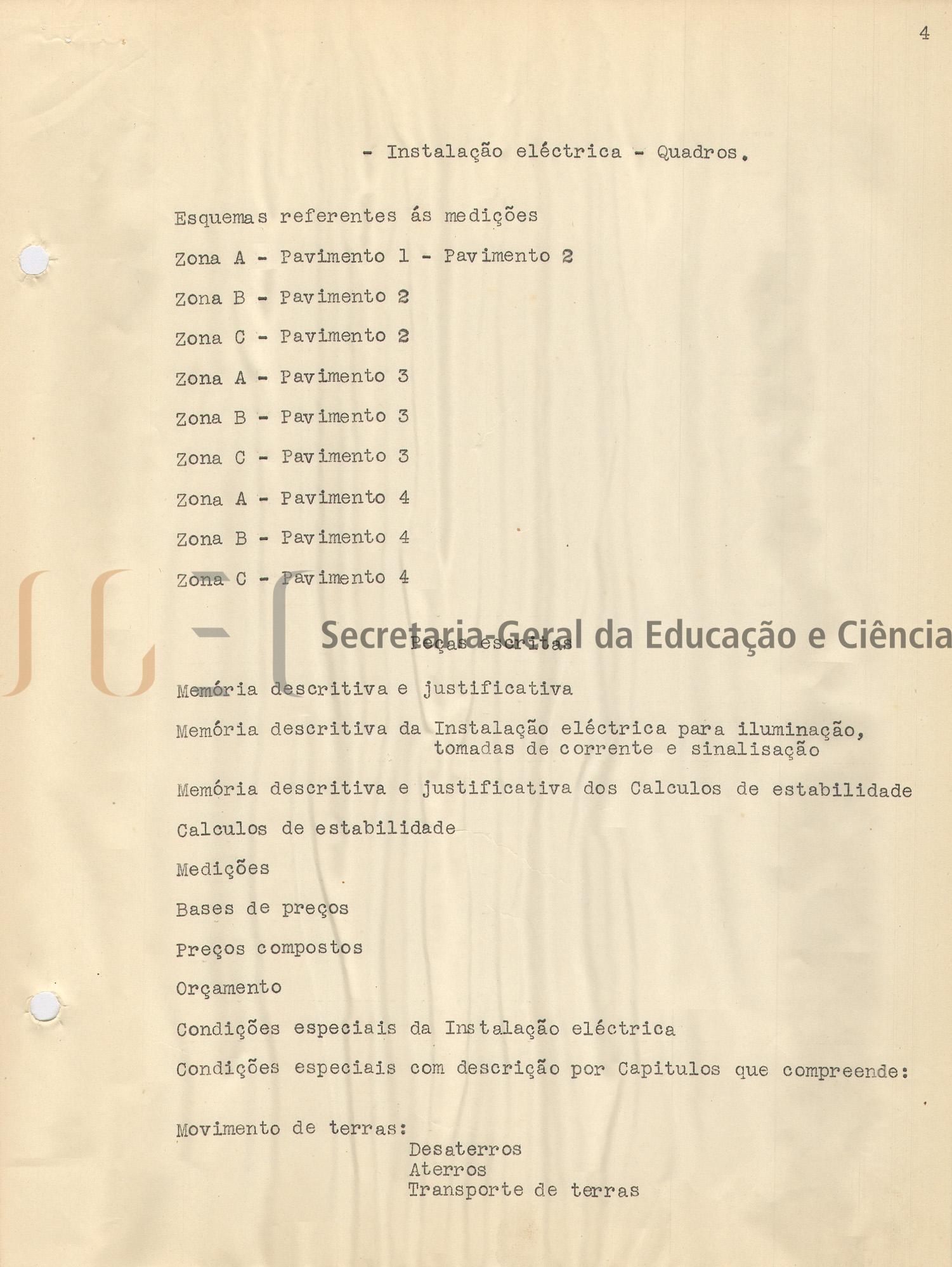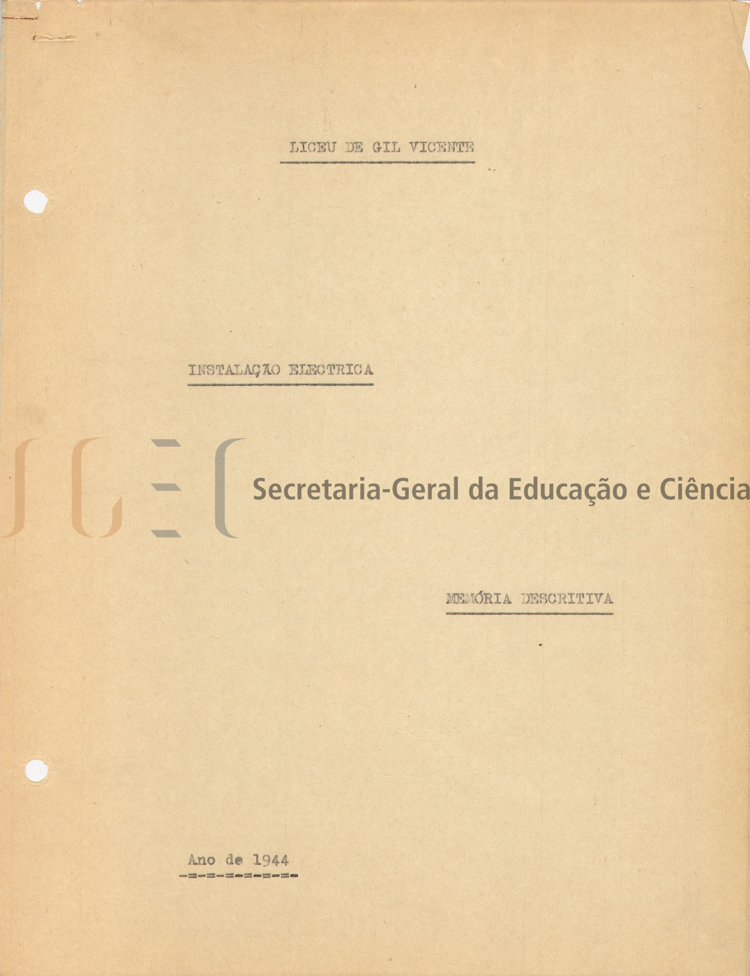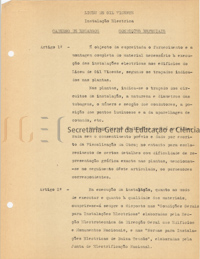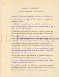 O volume das peças escritas (volume n.º 463) inclui: memória descritiva e justificativa, com data de 25 de fevereiro de 1944; cálculos de estabilidade; instalação elétrica; condições especiais; caderno de encargos.