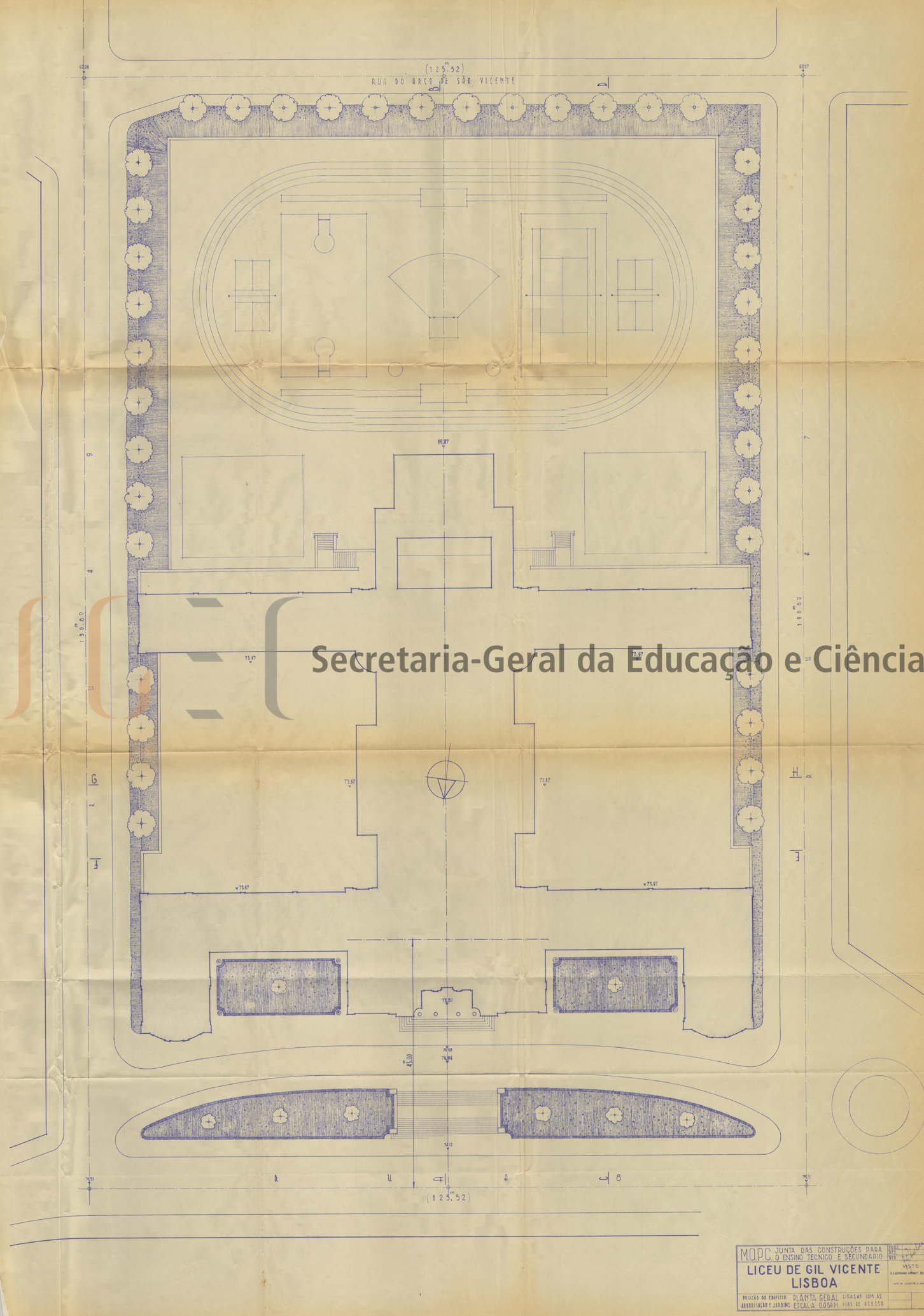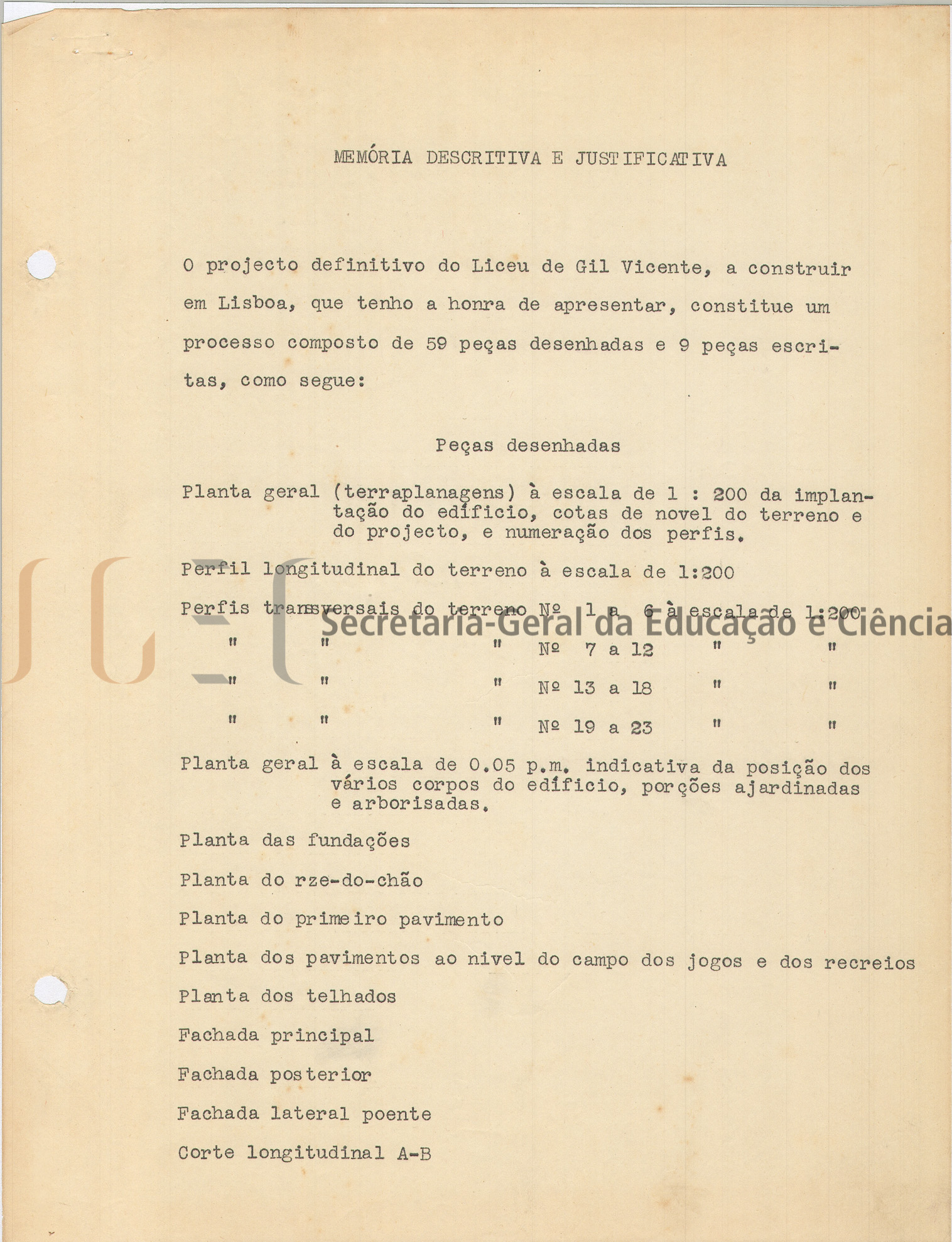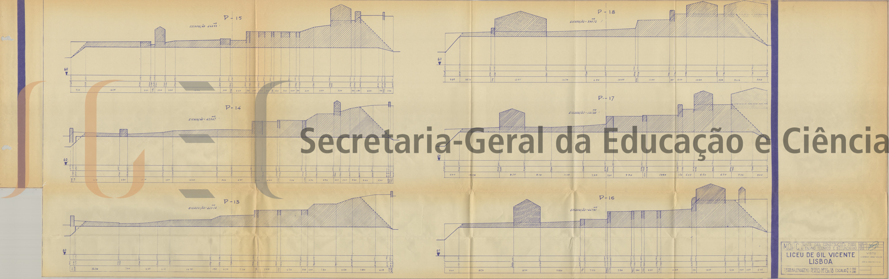 O volume das peças desenhadas (volume n.º 459) é composto por 58 peças: planta geral; planta de terraplanagens; perfis; fundações; planta do telhado; fachadas; cortes; pormenores; planta esquemática canalizações, águas, gás e esgotos; instalações elétricas; coberturas; estruturas e medições.