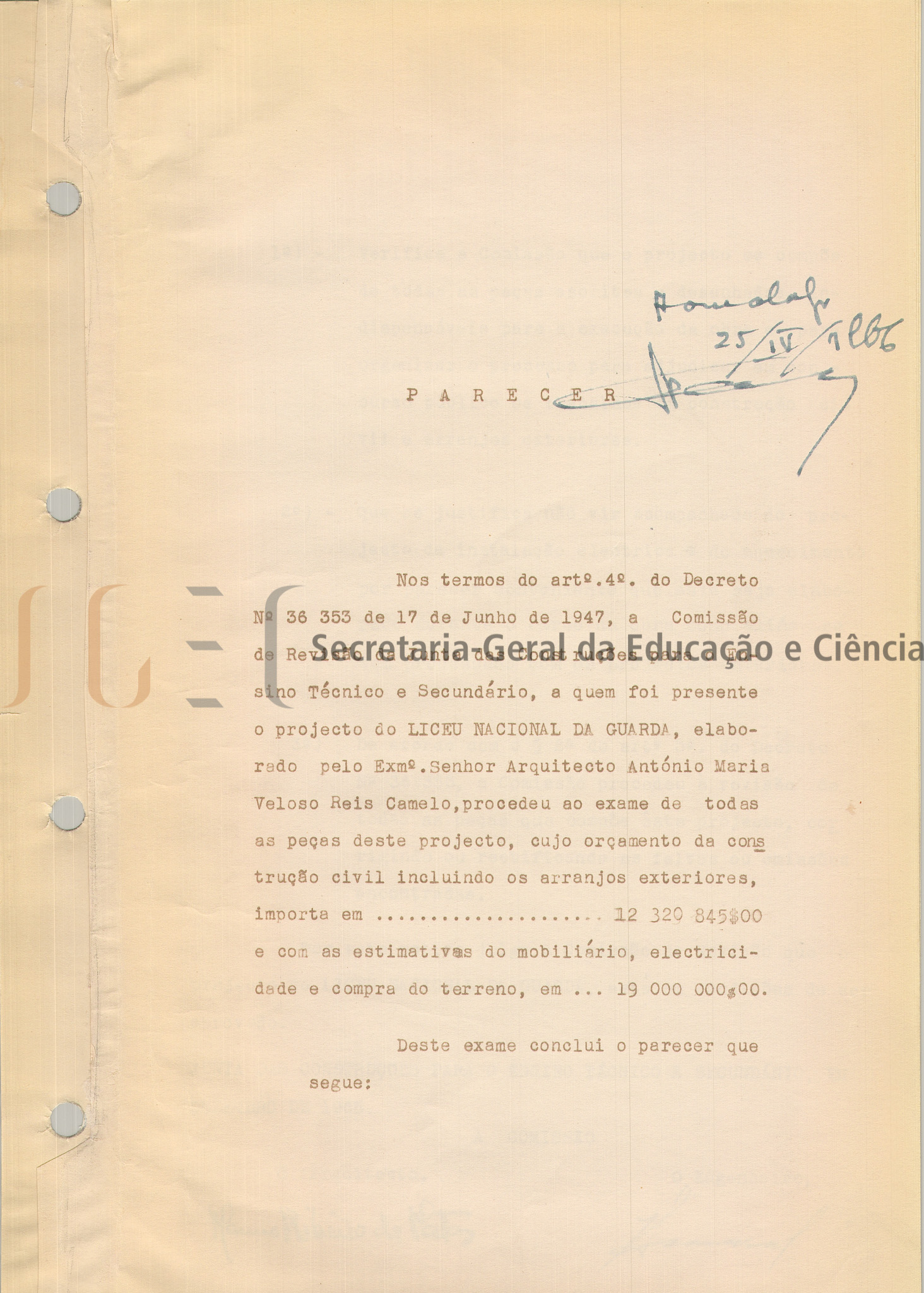 Âmbito e conteúdo Projeto com a designação de "Liceu da Guarda", na lombada dos volumes e no seu interior com a designação de "Liceu Nacional da Guarda", constituído por peças escritas (volume n.º 330) e peças desenhadas (volumes n.ºs 328 e 329).