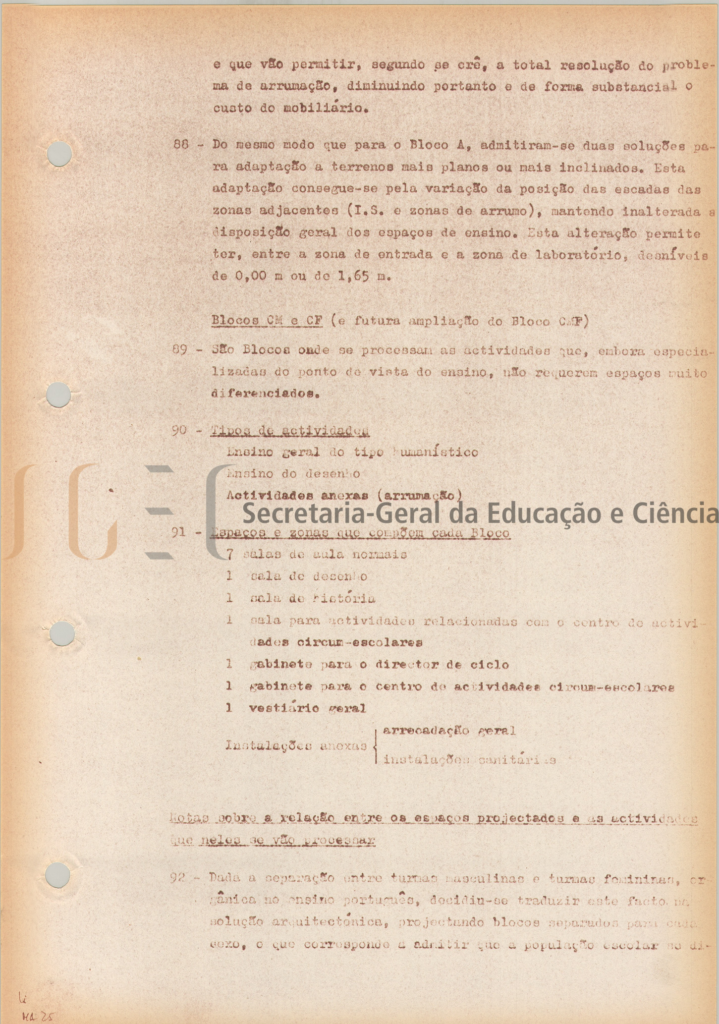 Discriminação das dependências: núcleo central que integra todos os serviços comuns contendo: secretaria, zona administrativa, zona do corpo docente, zona de actividades sociais (polivalente e anexos), zona de refeições, zona de espectáculos e educação musical (palco, sala de música e canto coral), zona de leitura (biblioteca), zona de ensino de línguas vivas (laboratório de línguas) e serviços gerais, (cantina, papelaria, etc.). Nos 3 núcleos de aulas agrupam-se: 14 salas normais, 2 salas de desenho, 13 salas para as disciplinas especializadas, 3 laboratórios, 1 anfiteatro, 2 salas para as actividades circumpolar-escolares e anexos. Existe ainda um bloco comportando o ginásio com anexos."