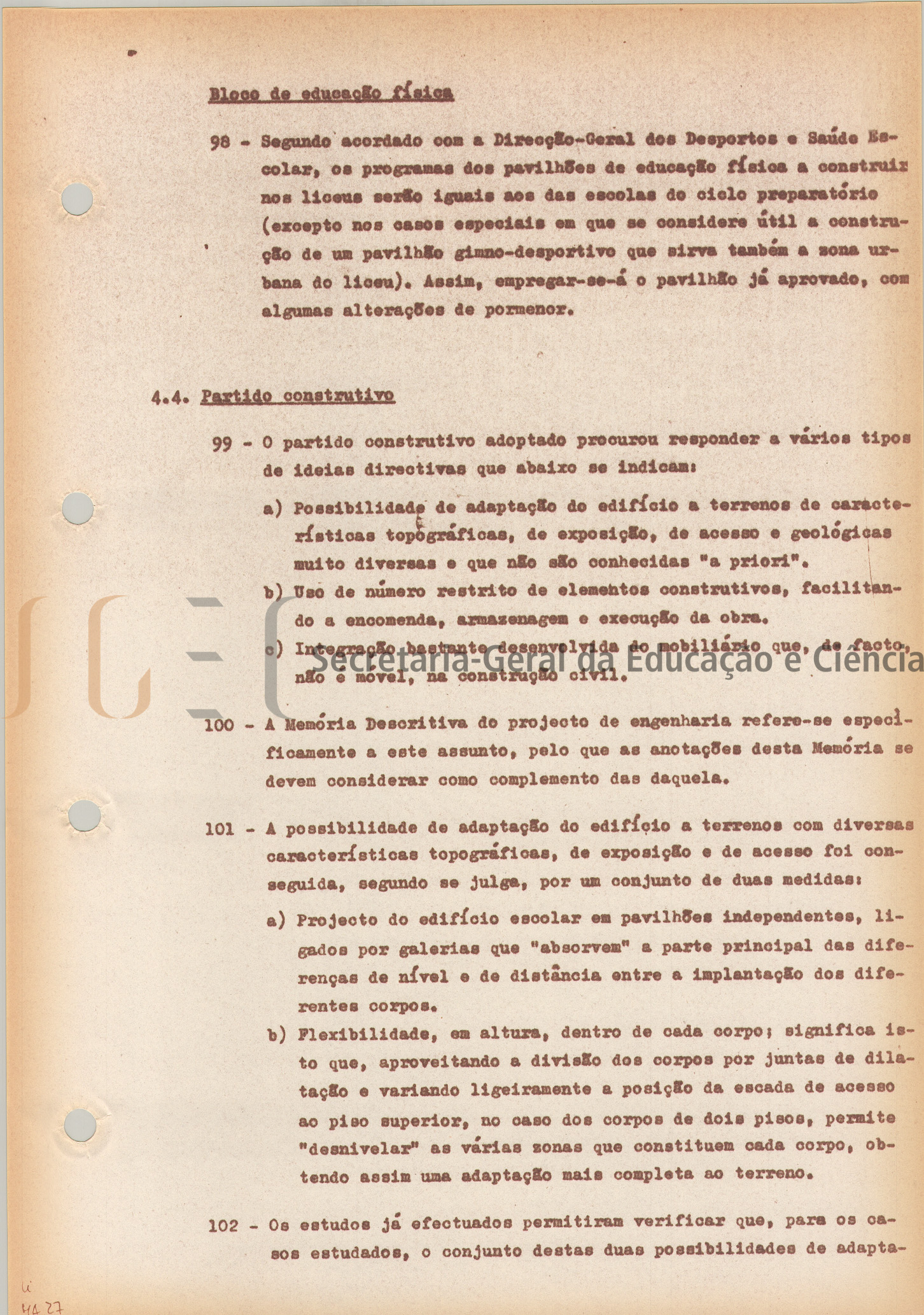 Os volumes das peças escritas incluem: parecer da Comissão de Revisão da Direção das Instalações para o Ensino Secundário e Médio; memória descritiva e justificativa; cálculos; caderno de encargos; medições; mapas de medições e orçamento.