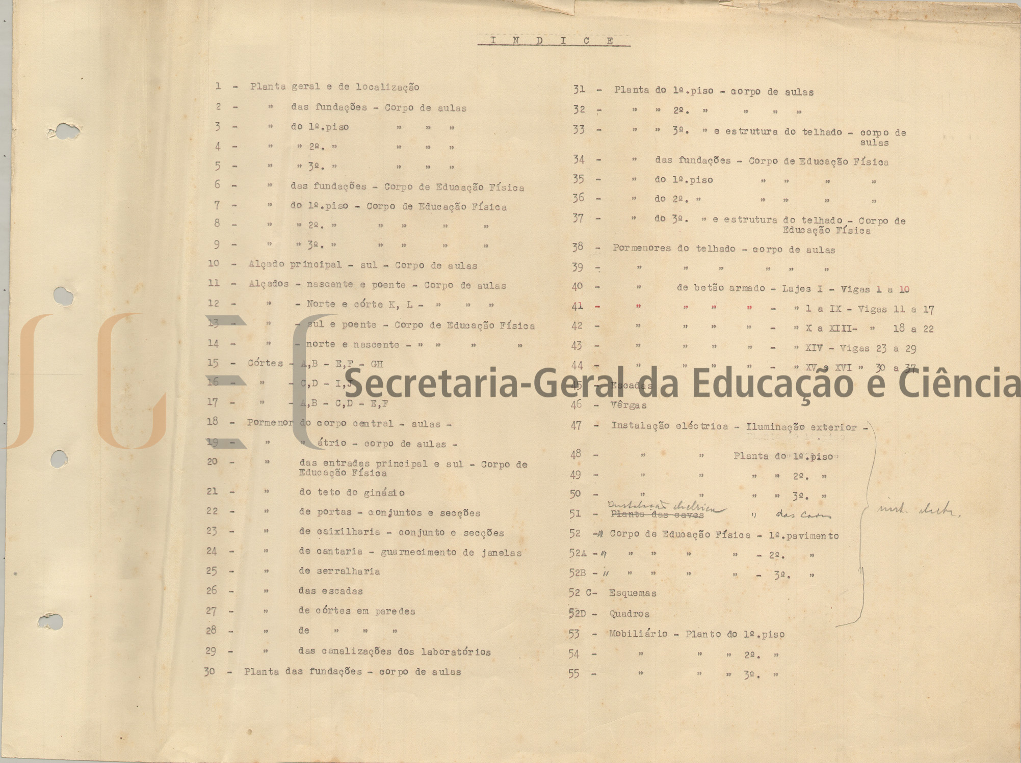 O volume das peças desenhadas é composto por 55 peças e inclui: índice; planta de localização; planta de fundações; cortes; alçados; pormenores; mobiliário; estruturas; canalizações e eletrícidade."