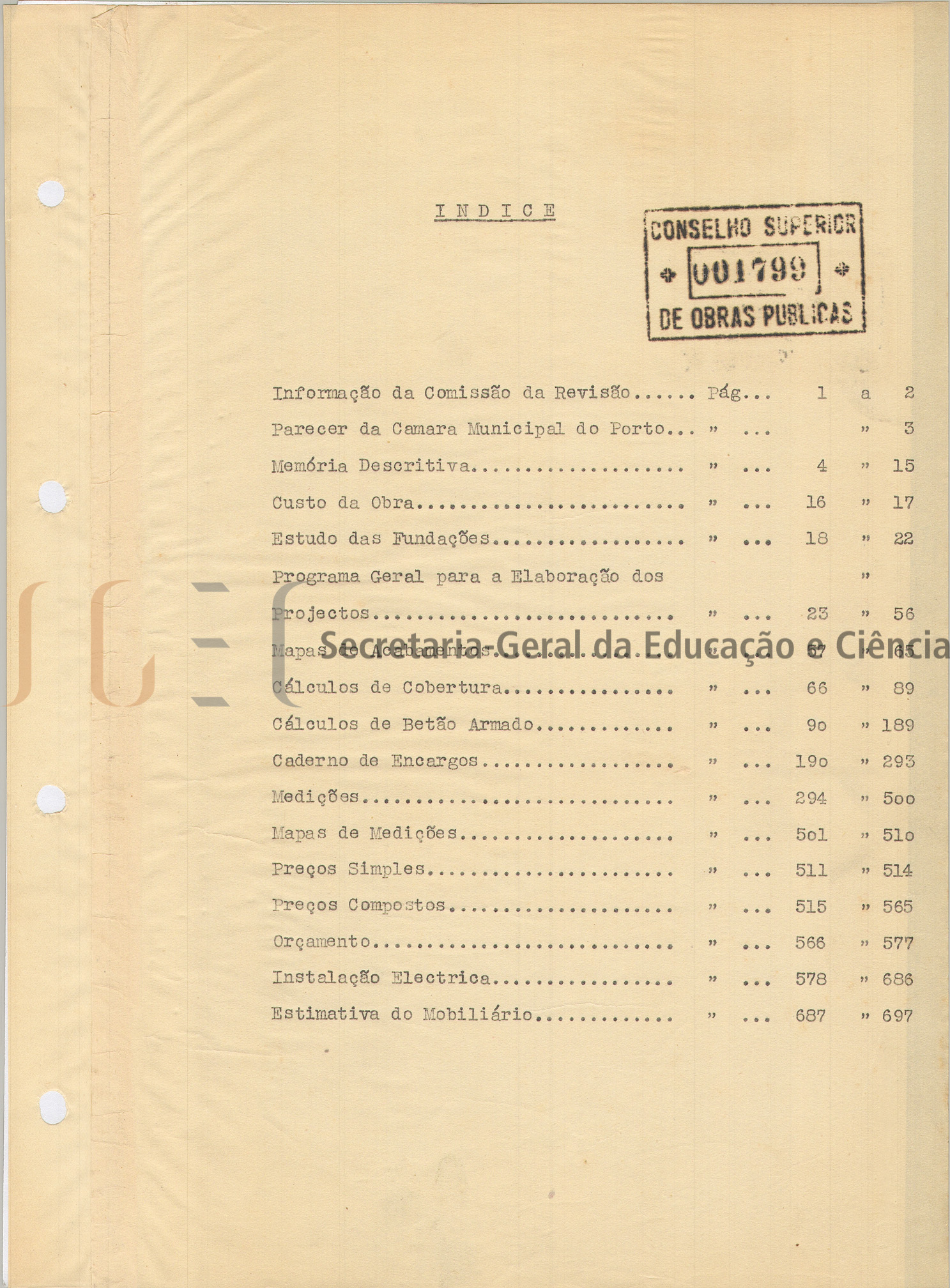 O volume das peças escritas inclui: índice; informação da Comissão da Revisão; parecer; memória descritiva e justificativa; custo da obra; estudo das fundações; programa geral para a elaboração dos projetos; mapa de acabamentos; cálculos; cadernos de encargos; medições; mapa de medições; preços simples e compostos; orçamento; instalação elétrica e estimativa de mobiliário.