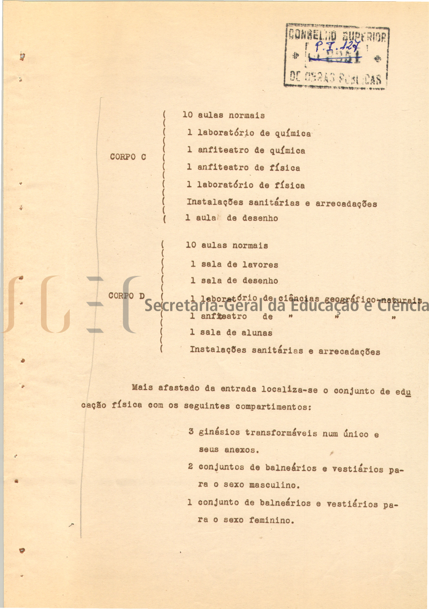 Ante-projeto do Liceu Nacional de Cascais é constituído por peças escritas e peças desenhadas (volume n.º 392), com carimbo do Conselho Superior de Obras Públicas n.º PI 127 e inclui: memória descritiva e justificativa (referindo que o aumento da população em algumas zonas do país obrigou à criação de alguns novos liceus entre os quais o de Cascais); estimativa de custo de acordo com o despacho de 20 de dezembro de 1956 e 12 peças desenhadas compostas por: planta de localização; planta geral; planta geral de canalizações; plantas de conjunto dos dois pavimentos e alçados.
